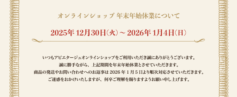 土日・祝日は定休日となっておりますため、発送及びお問い合わせのお返事は定休日明けの対応とさせていただきます。