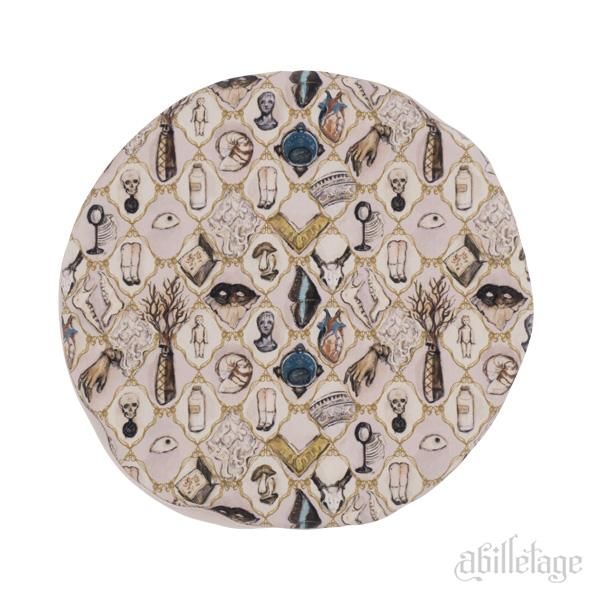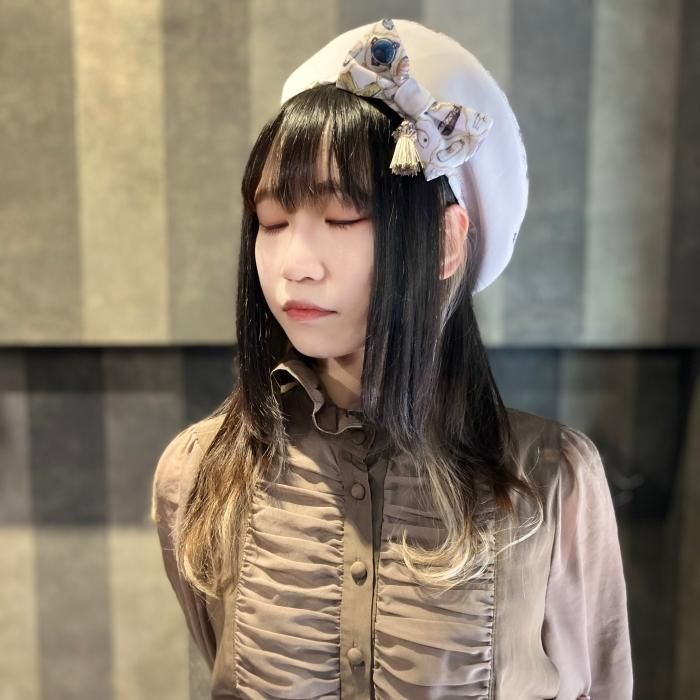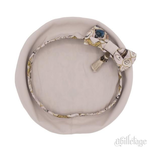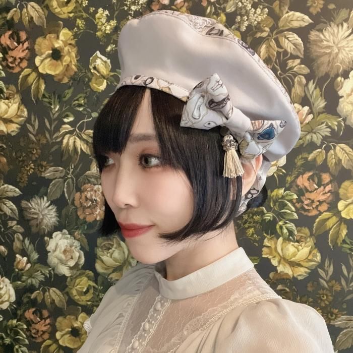 サイドは無地でシンプルに、縁とトップにはアートワークの柄を大胆にあしらったベレー帽です。