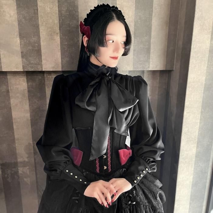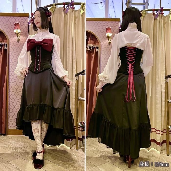 ロングコルセットはハリのある大きなリボンが胸元を覆うデザインに。