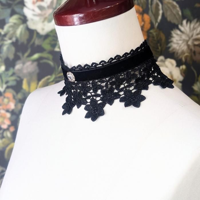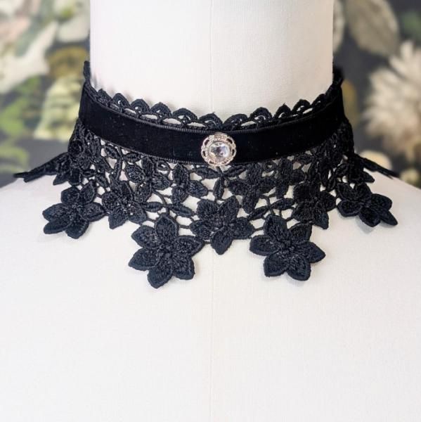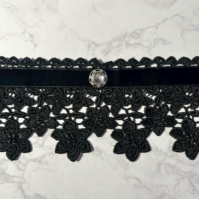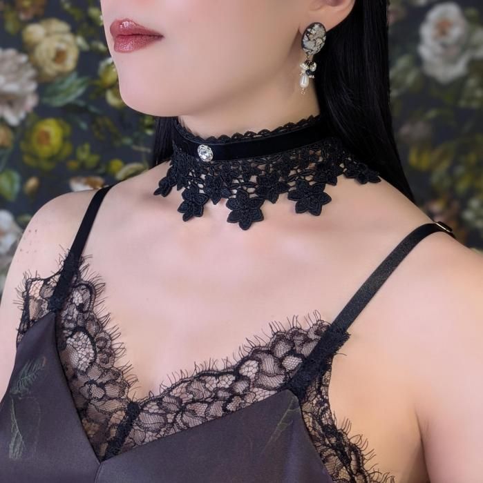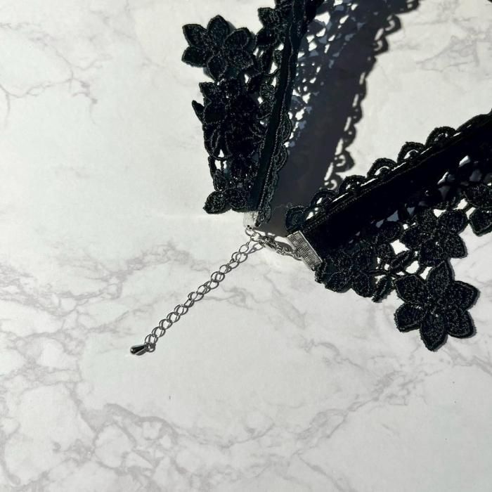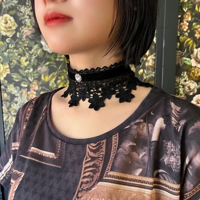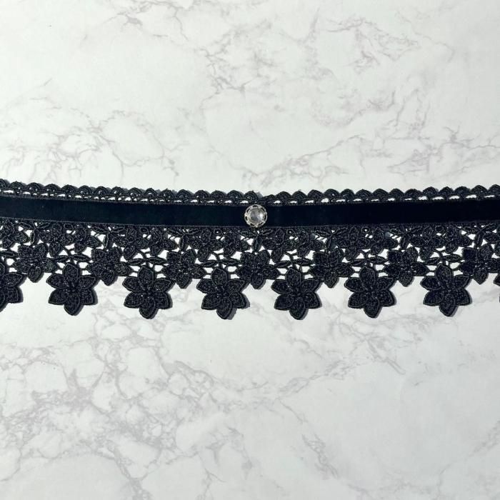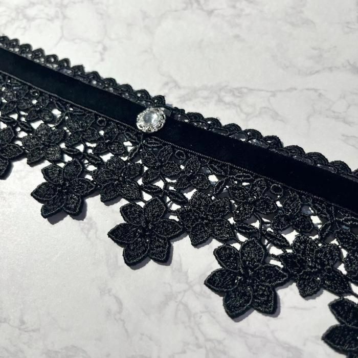 ◇レースチョーカー 胸元を美しく飾る繊細なレースは、コーデに欠かせないアイテム。 放射状に広がる百合のレースが美しい華やかなチョーカーです。 上品なブラックのベロアリボン中央にはきらりとクリアビジューが輝きます。 <サイズ> 長さ:約29.5cm+アジャスター約5.5cm