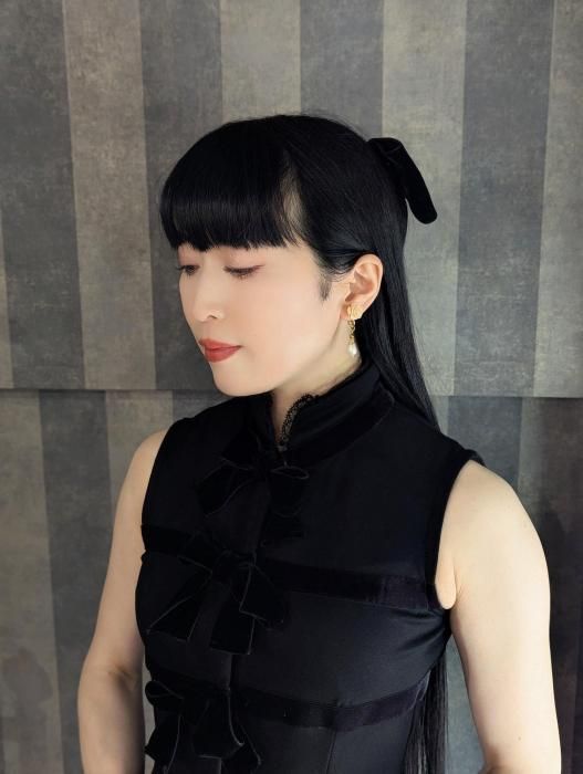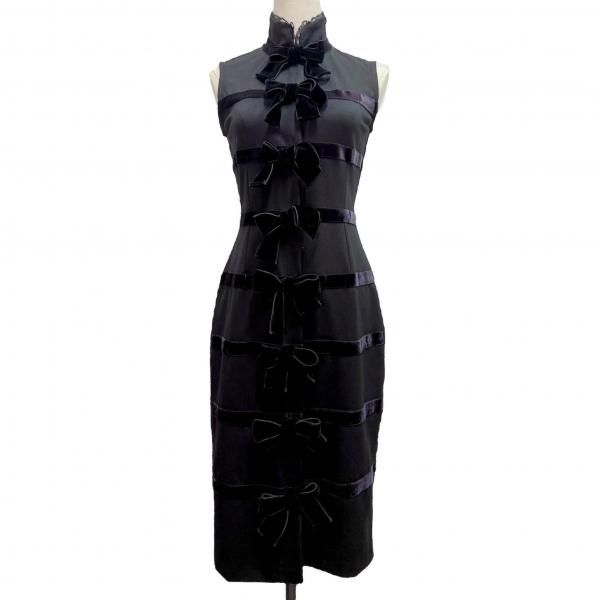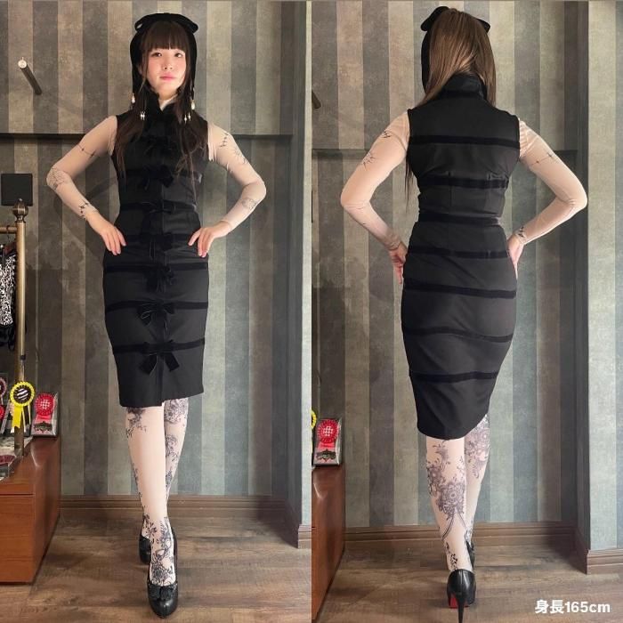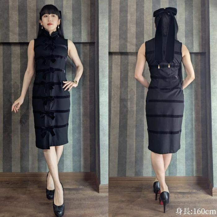 ◇Ribbon Cage Dress(Black)◇ 肌触りの良い程よい厚みのストレッチ生地に別珍リボンを使用したドレス。 リラックス感がありつつも、上品な雰囲気を演出する一着です。 内側はボタン仕様で、飾りリボンはあらかじめ結ばれたデザイン。 身頃をぐるりと囲むリボンがアクセントになっています。 スタンドカラーの襟元にはリバーレースがあしらわれています。 サイズ B 84〜 W 68〜 H 92〜 着丈およそ98cm 素材 レーヨン69% ナイロン29% ポリウレタン2%