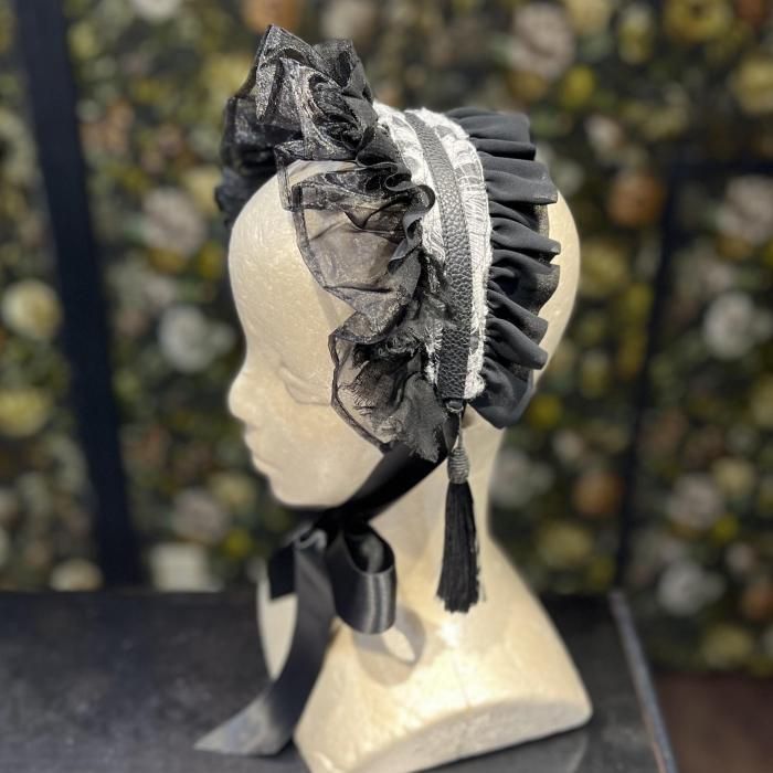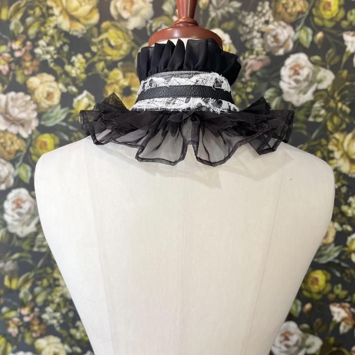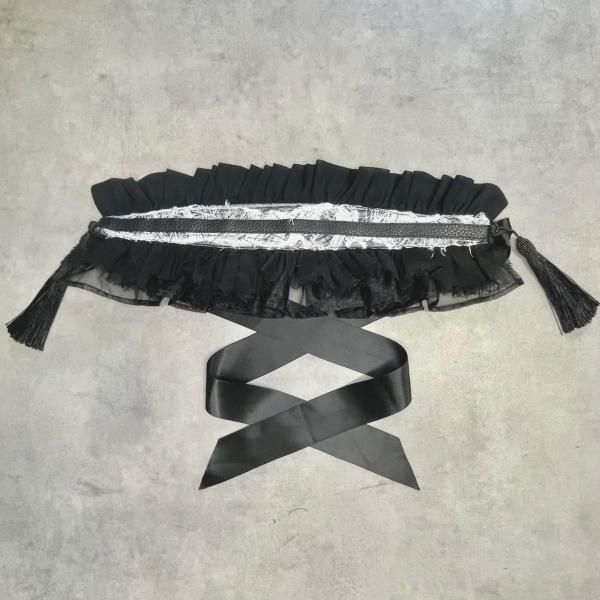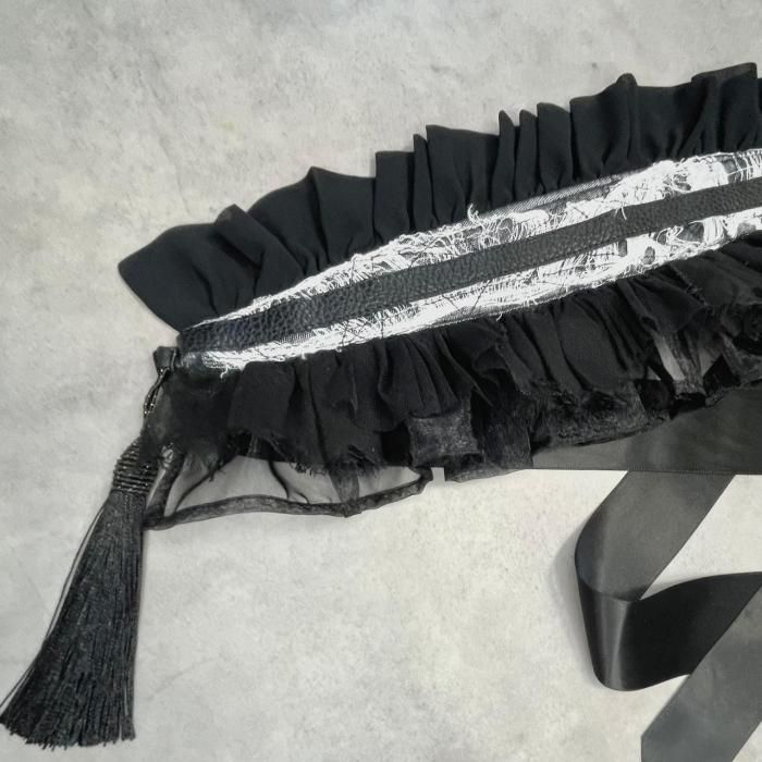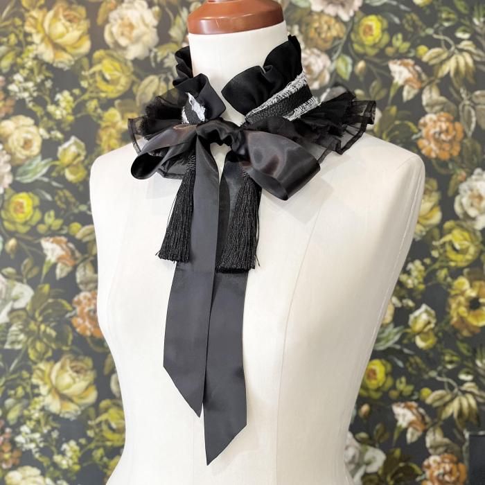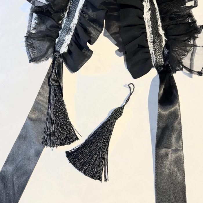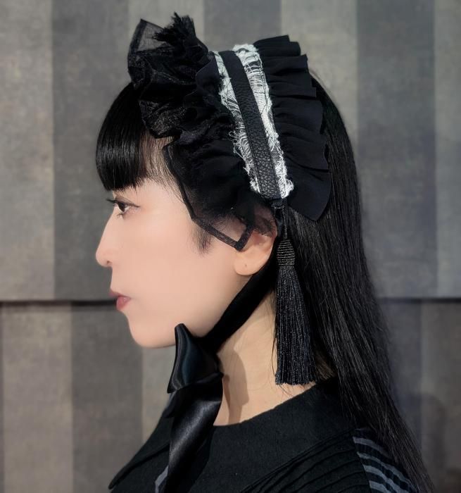 ◇チョーカーヘッドドレス◇ スタンドカラーのつけ襟としても使用できる2wayのヘッドドレス ━━━━━━━━━━━━━━━━━━ 生地の劣化や糸のほつれが退廃的な世界観を演出するdamage gauzeシリーズ 大胆に使用したガーゼや包帯は不安定な心の中身を表現し、 負った傷を治すイメージでステッチワークを施しています。 ※タッセル取り外し可能 ━━━━━━━━━━━━━━━━━━ ドレッシーなスタイルだけでなく、 カジュアルなスタイルや黒いお洋服に合わせることを想定し光沢感や素材感をこだわりました。 サイズ 本体:横⋯約36cm 縦⋯4cm(フリル込みで約13cm) リボン長さ:約54cm
