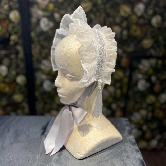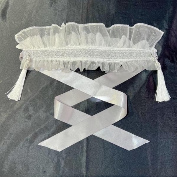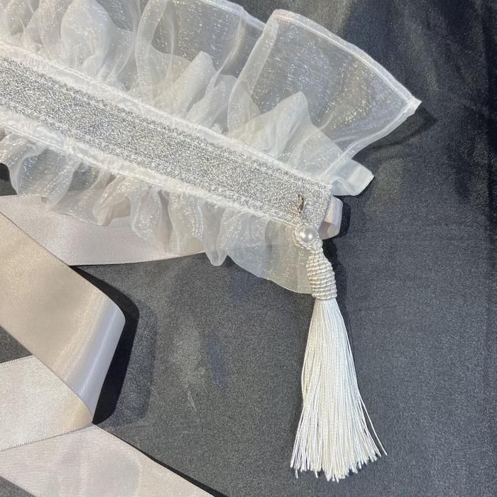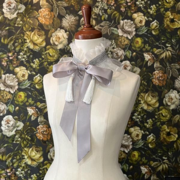薄暗い光を浴びて怪しく輝く、優しいグレーホワイトのヘッドドレス