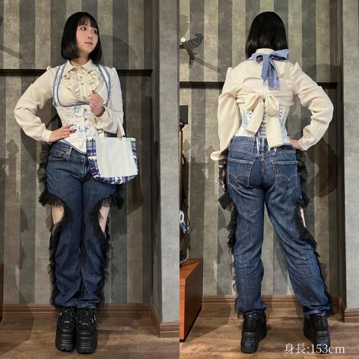 Plaid de Mémoire(プレイド・ドゥ・メモワール) 記憶の断片を織り重ねたようなクラシカルなチェックシリーズ。 懐かしさと気品をあわせ持つ柄は、日常にも特別なシーンにも寄り添います。 色ごとに異なる表情を映し出し、纏う人の記憶とともに深まっていくコレクションです。 背中のリボンが印象的なブラウスです。 リボンを調整することで、身体にフィットした美しいラインをお楽しみいただけます。 インナーにはキャミソールはもちろん、薄手のカットソーを合わせても素敵に着こなしていただけます。 また、コルセットと合わせる際には下のリボンを結ばず、身体に巻きつけるようにしていただくとすっきりとしたシルエットでご着用いただけます。 素材 ポリエステル100% サイズ ワンサイズ バスト…約89cm 袖丈…約63.5cm 着丈…約52cm 袖口…約21cm