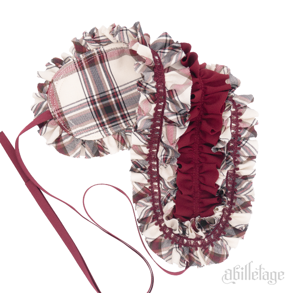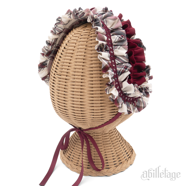 Plaid de Mémoire(プレイド・ドゥ・メモワール) 記憶の断片を織り重ねたようなクラシカルなチェックシリーズ。 懐かしさと気品をあわせ持つ柄は、日常にも特別なシーンにも寄り添います。 色ごとに異なる表情を映し出し、纏う人の記憶とともに深まっていくコレクションです。 チェックとアクセントカラーのフリルを組み合わせ、クラシカルな印象に可憐なアクセントを添えました。 ※顎の下、もしくは頭の後ろで紐を結んで固定してください。