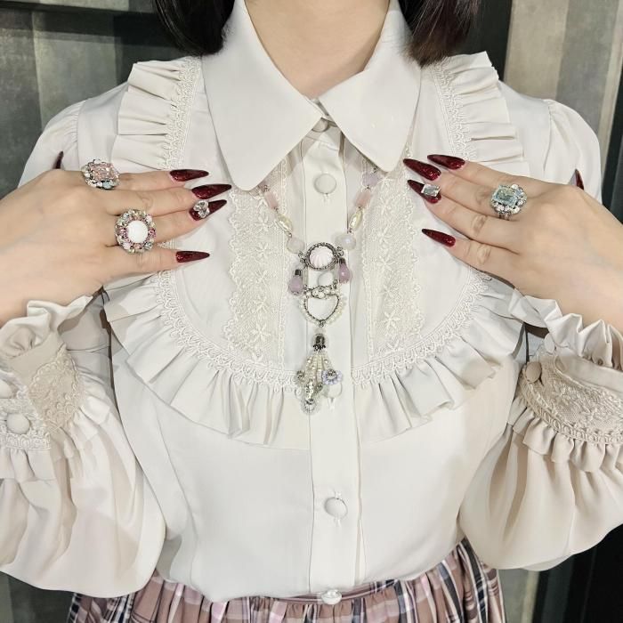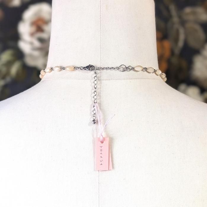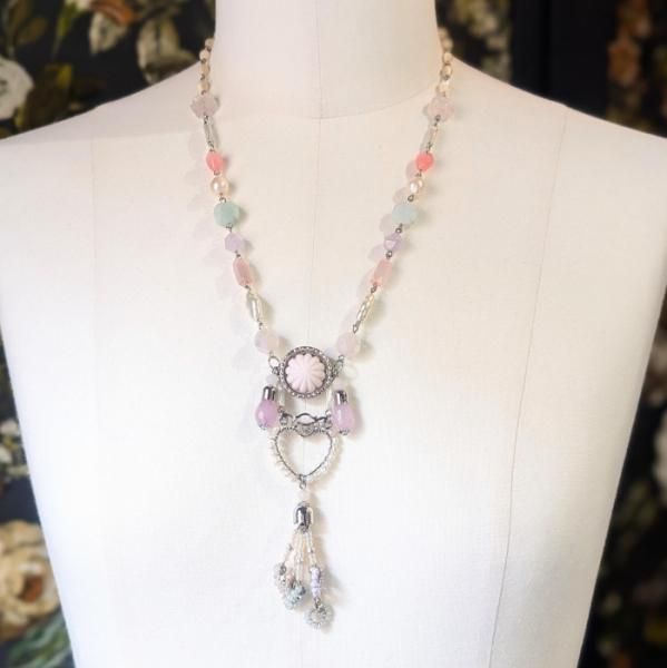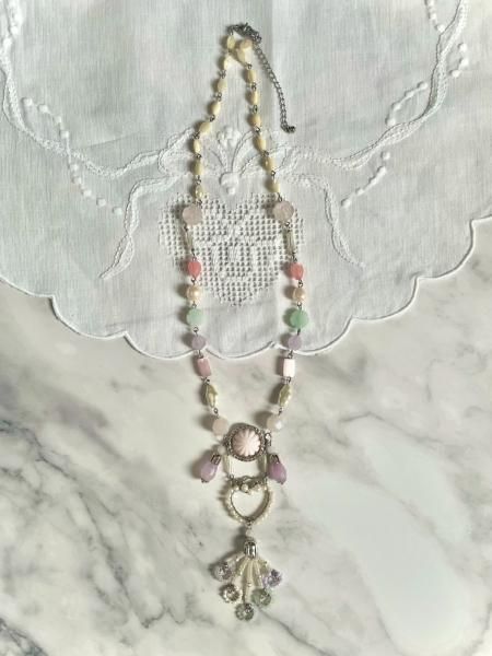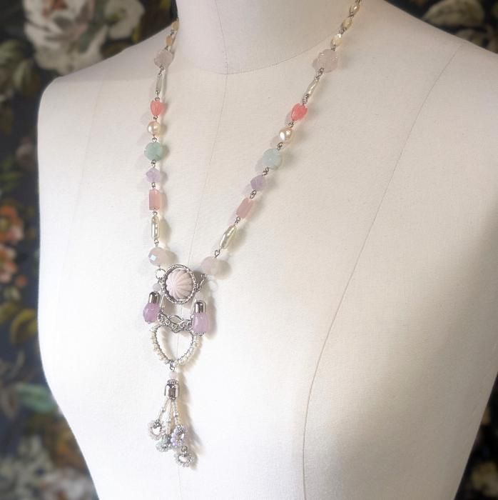 ◇トロイメライ ネックレス◇ コロコロとした砂糖菓子のようなチェーンと 光を受けて輝く大ぶりのモチーフが特徴的なネックレス♪ アジャスターで長さ調整が可能です。 サイズ・素材 長さ:51cm 素材:ローズクォーツ、アメジスト、アマゾナイト、ガラス、淡水パール、シェル、真鍮など 留め具のみステンレスです 中央のピンクのカボション(ガラス)、ガラスビーズにヴィンテージの素材を使用しています