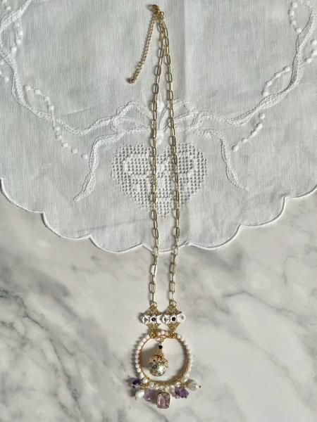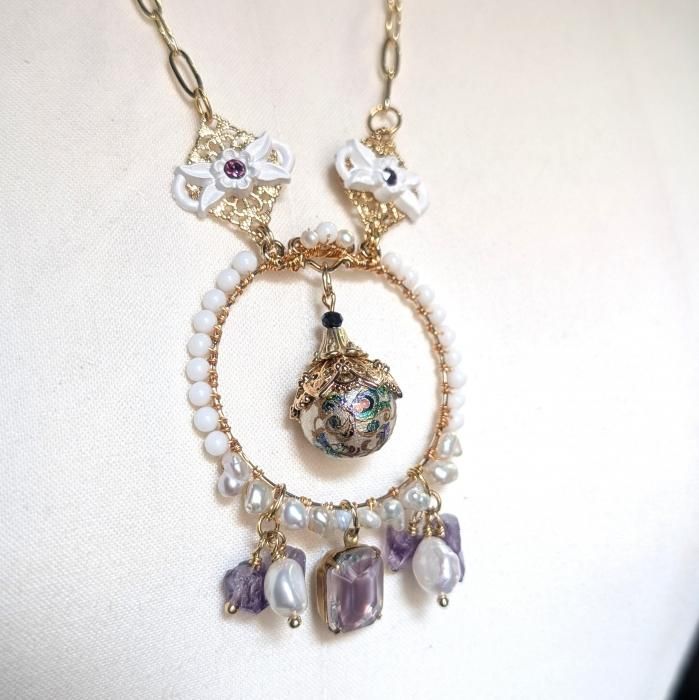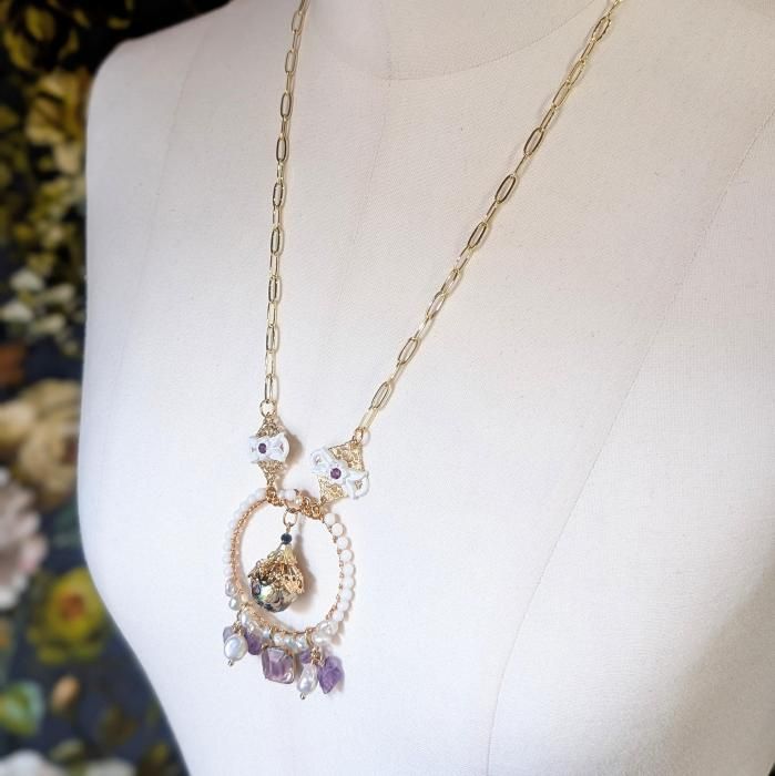 ◇空中庭園 ネックレス◇ 落ち着いたパープルが基調のネックレス フープの中央でゆらゆらと揺れるモチーフが印象的 サイズ・素材 長さ約57cm 素材:ガラス、真鍮、淡水パール、アメジスト、プラスチック、アマゾナイト、ステンレスなど 留め具のみステンレス素材です 中央のフープの裾の四角いガラスと透かしパーツの上の白いプラパーツはヴィンテージ素材です