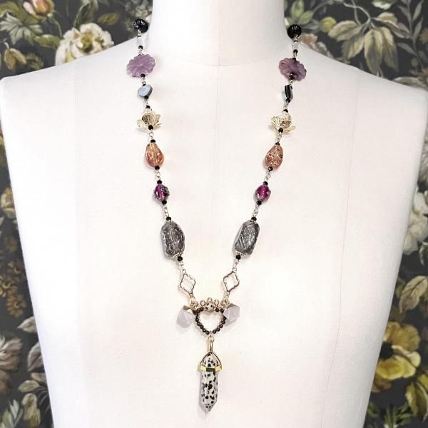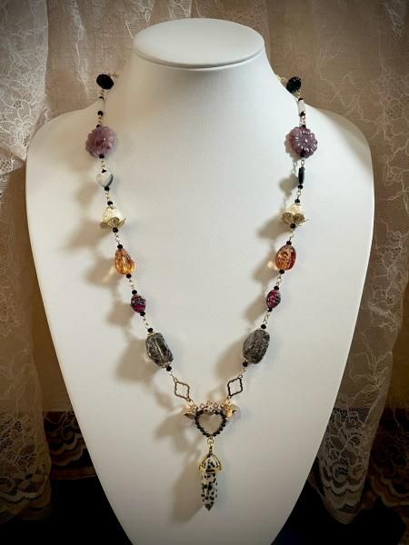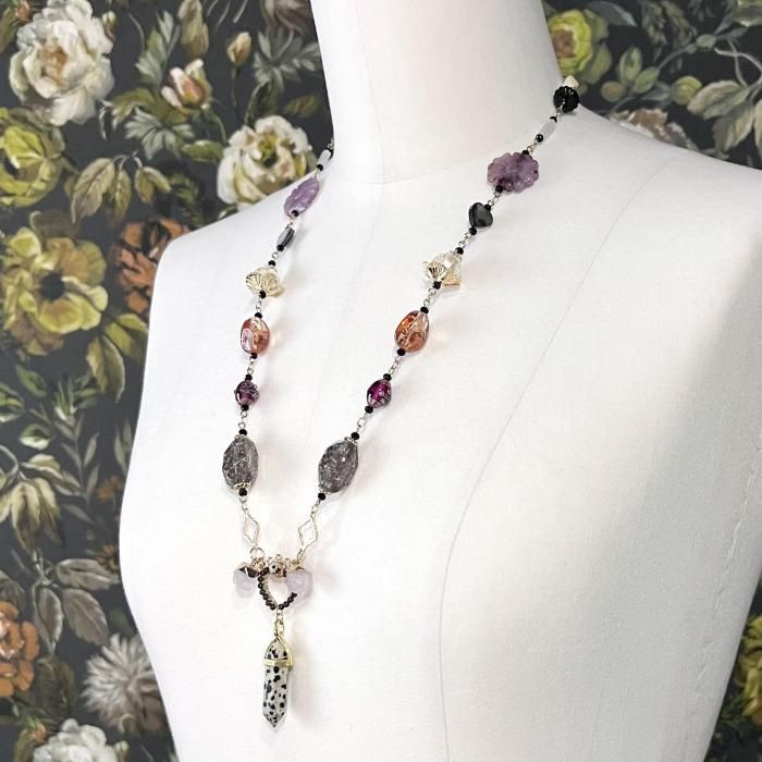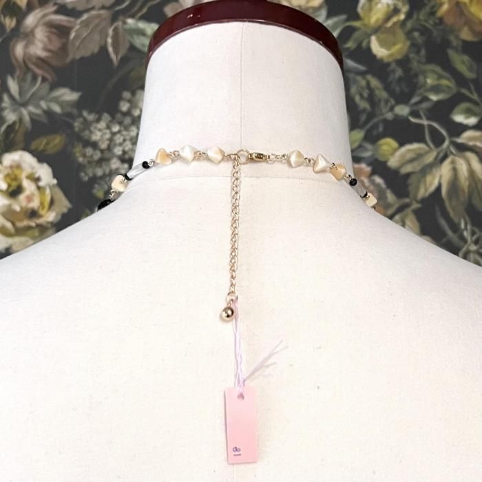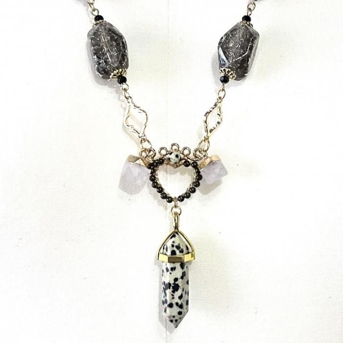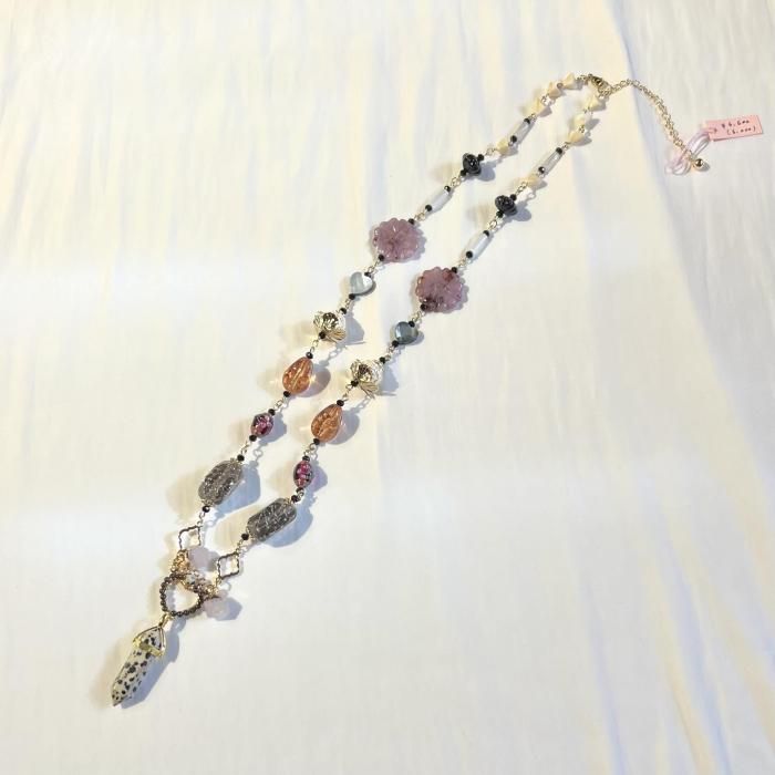 素材:ガラス、淡水パール、ダルメシアンジャスパー、アクリル、貝、ブラックオプシディアン、真鍮など