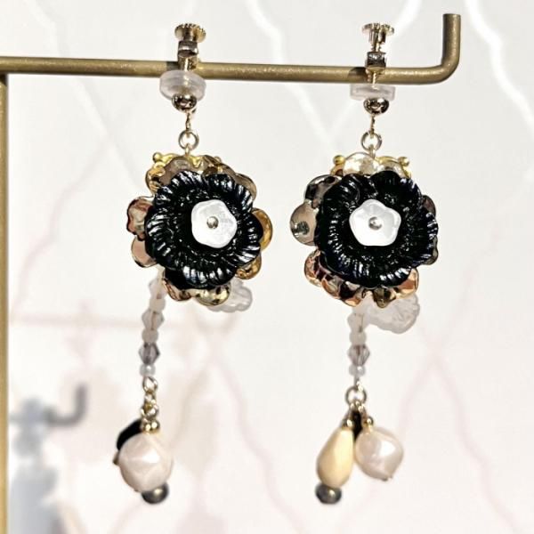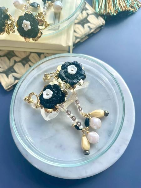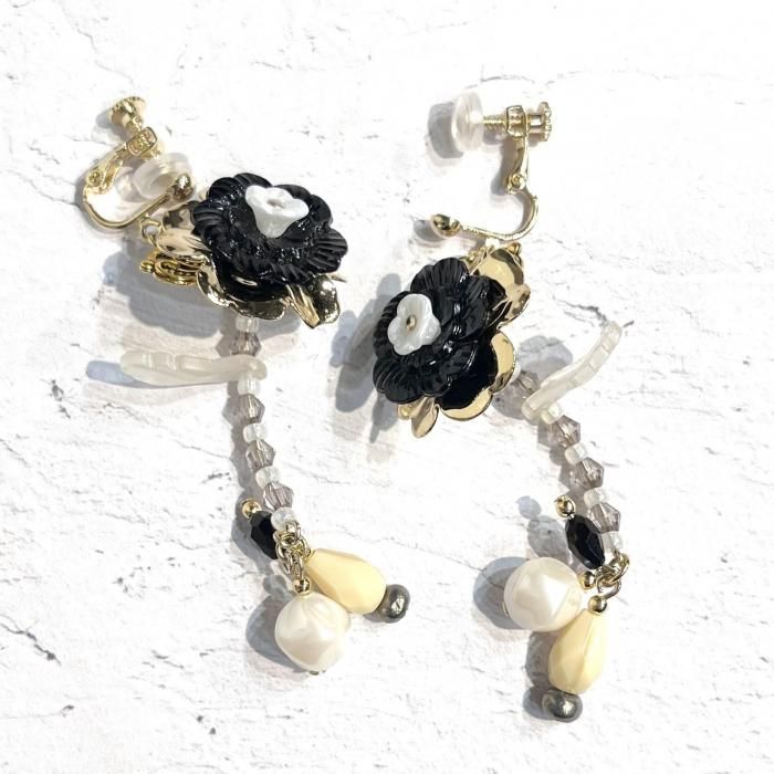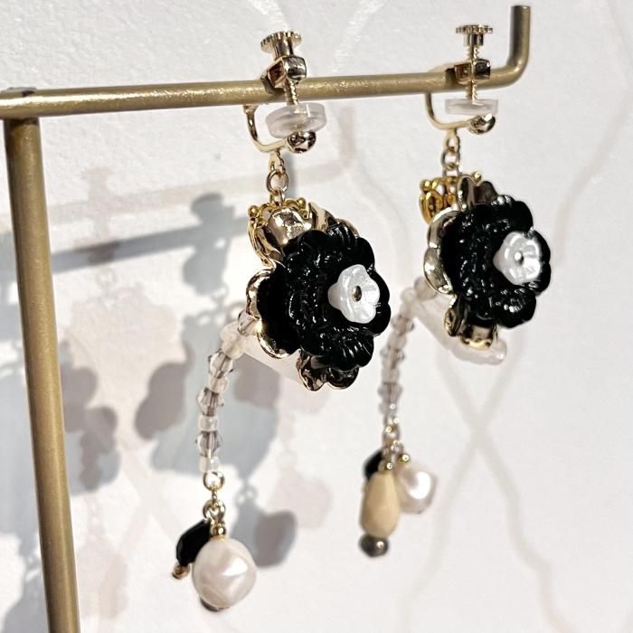 ◇花占い◇ サイズ・素材 サイズ:6×2cm 素材:ガラス、真鍮、プラスチックなど 黒いお花はヴィンテージパーツです