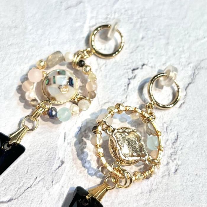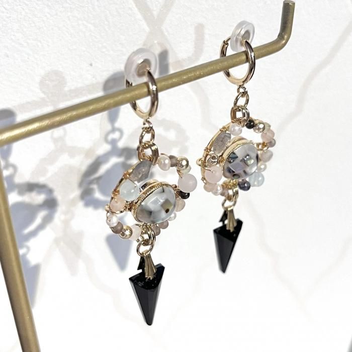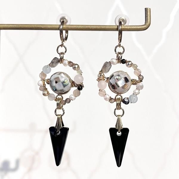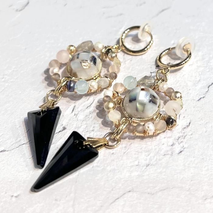 ◇星彩 耳飾り黒(小)◇ サイズ・素材 7×2.5cm 素材:貝、真鍮、ローズクォーツ、淡水パール、アゲートなど