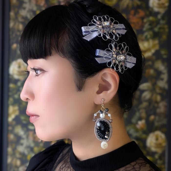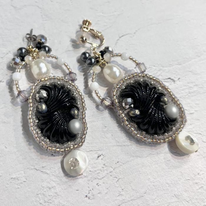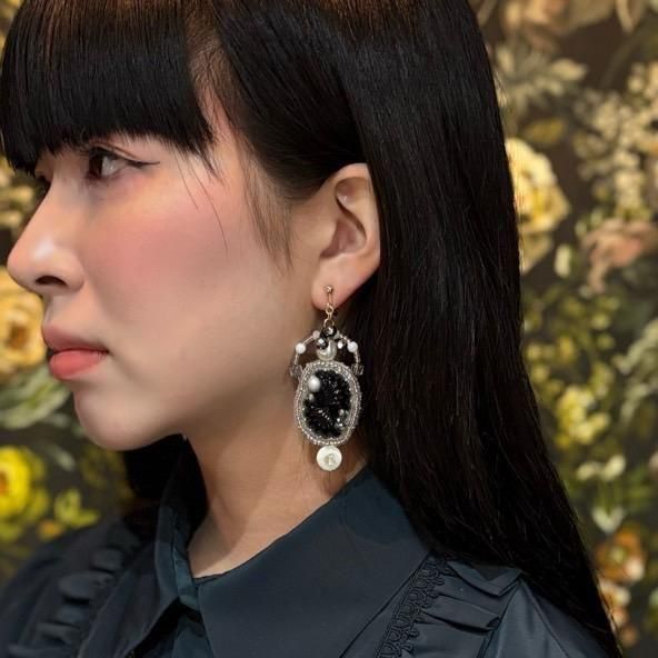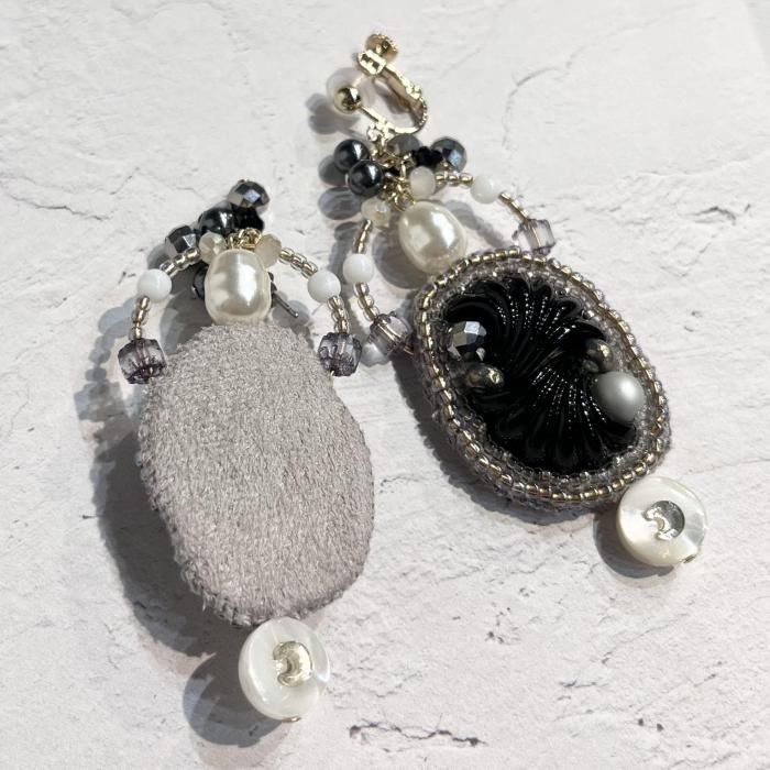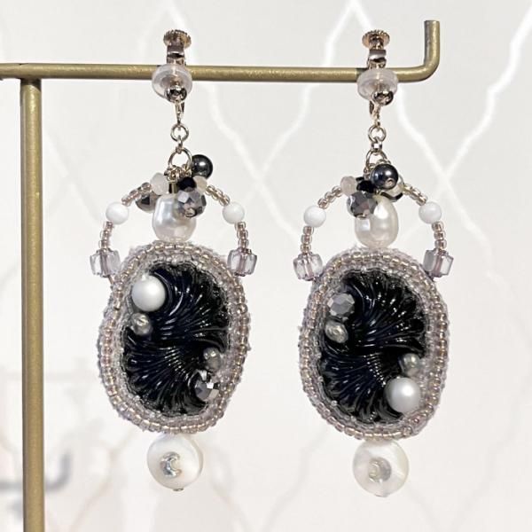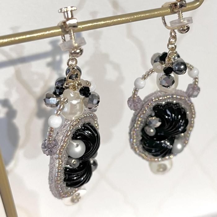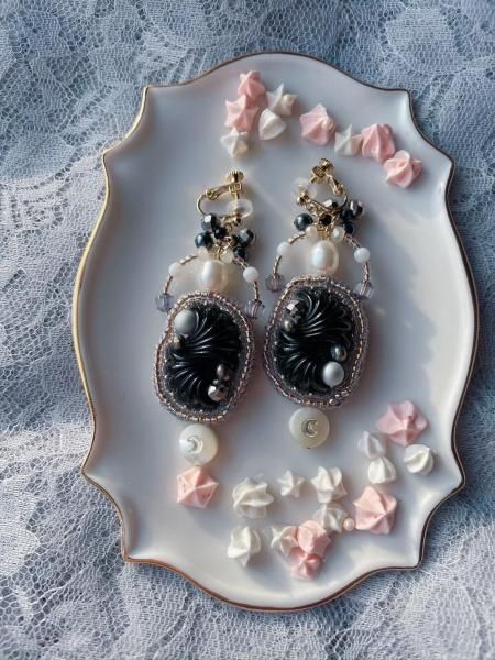 ◇パティスリー 耳飾り◇ ブラック×パールを基調とした上品でクラシカルな耳飾り 中央の黒いカボションに細かなビーズ刺繍が施され、 月モチーフのチャームが揺れるデザイン サイズ・素材 モチーフサイズ:約6×3cm 素材:フェルト、フェイクスエード、ガラス、プラスチックなど 中央の黒いパーツ(ガラス)はヴィンテージです