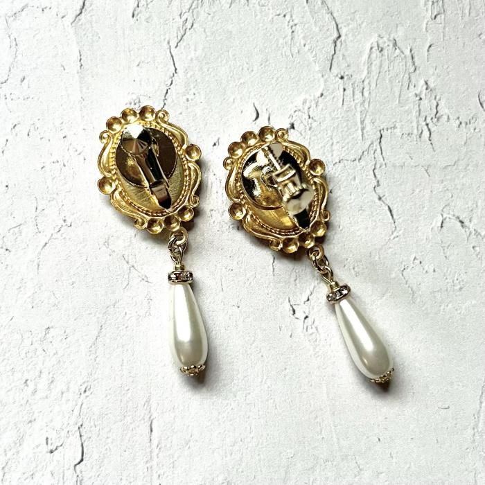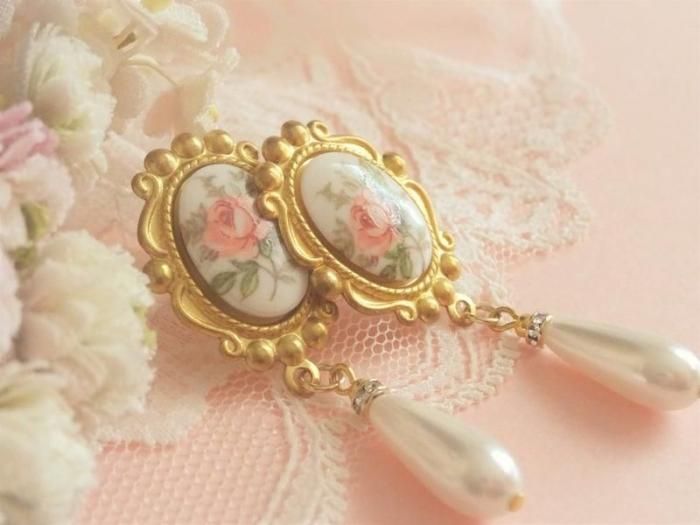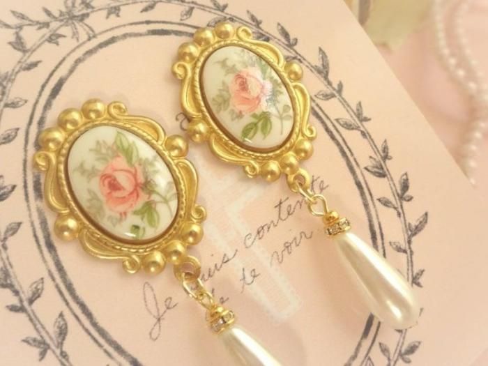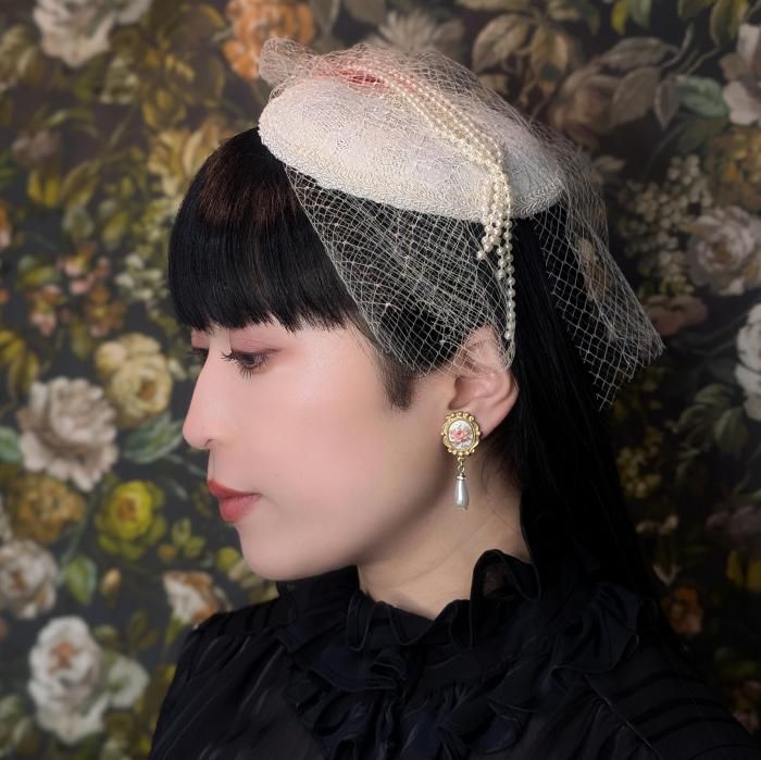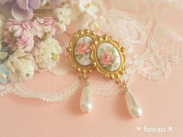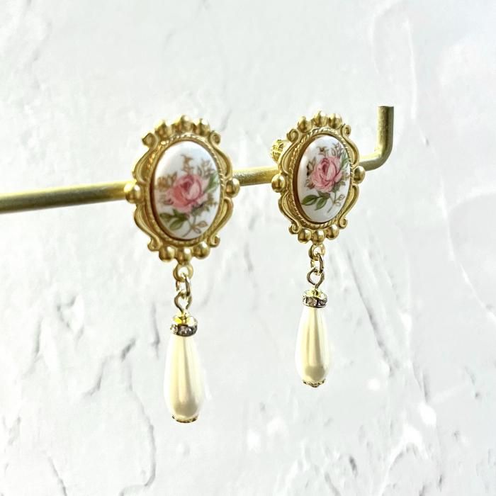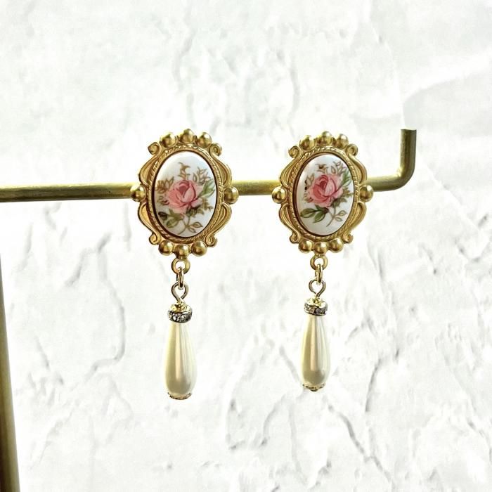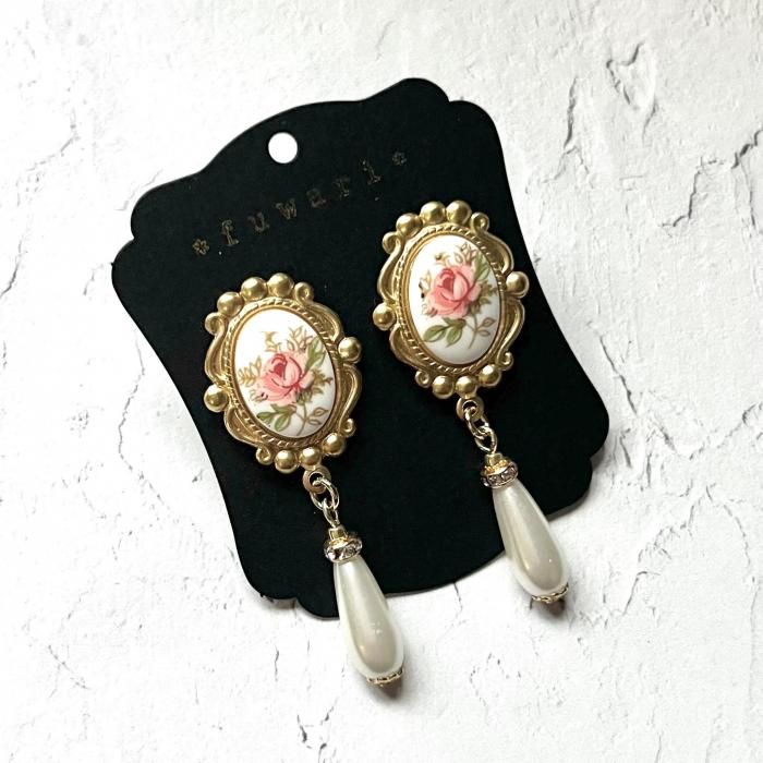 【*fuwari*】日本製ヴィンテージローズカボションの耳飾り(P308)
