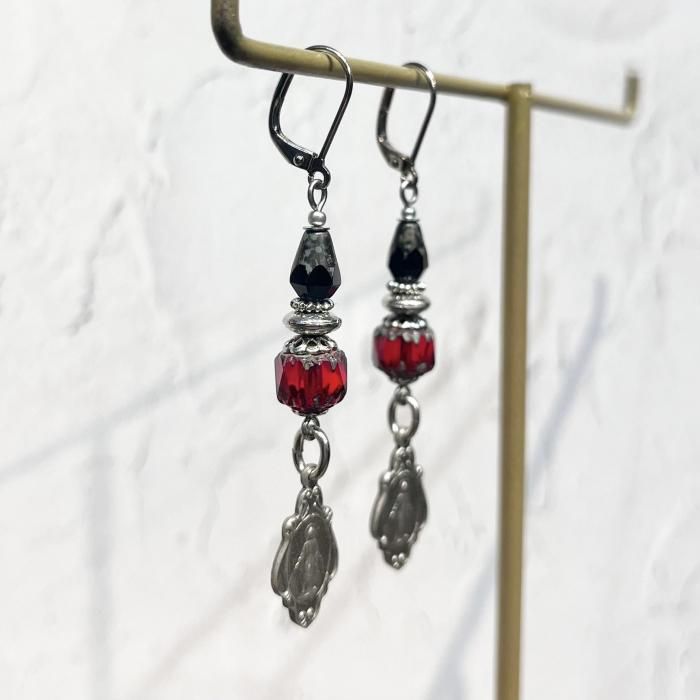 深紅のビーズが輝く、シルバーでまとめられた耳飾り。
