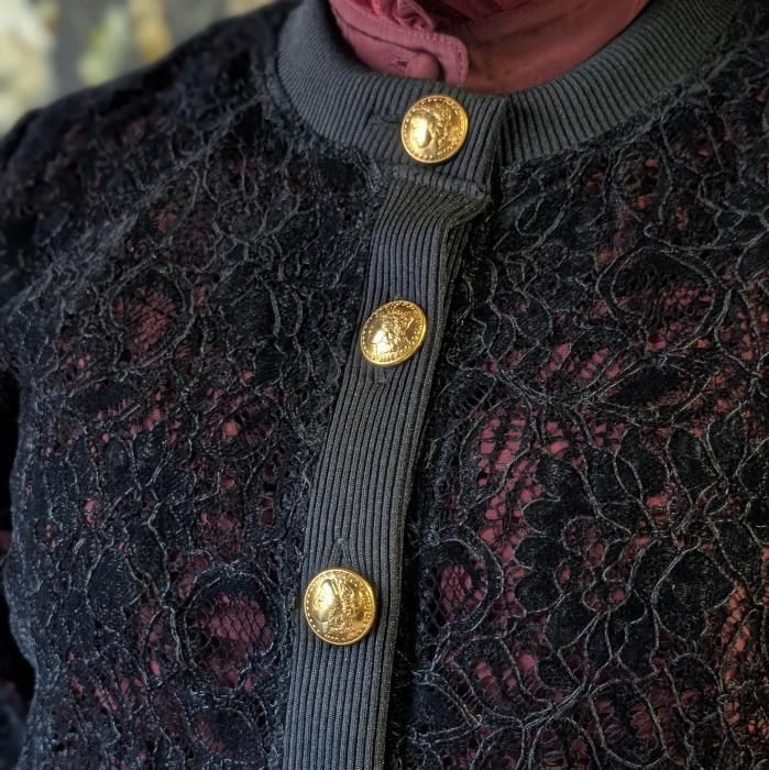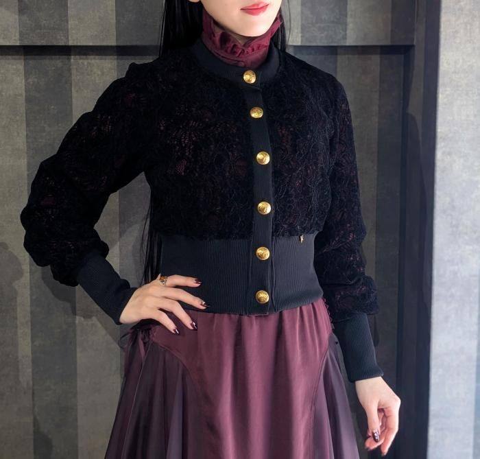 ゴールドのボタンが印象的なレース素材のカーディガン。