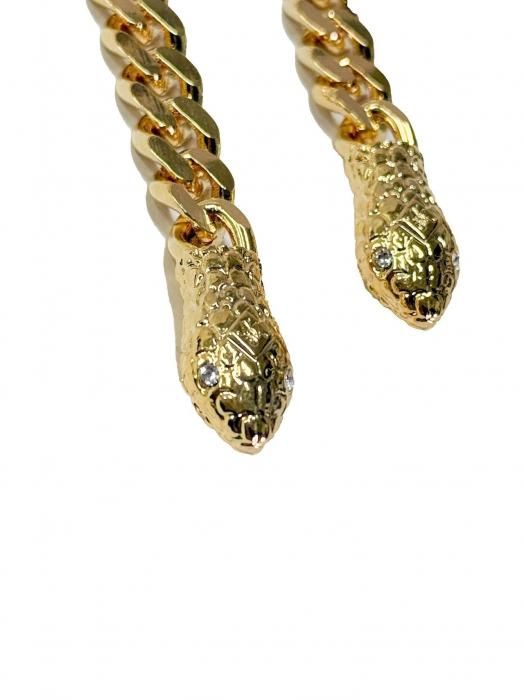◇Snake Lariat Chain◇ 大小2種類のチェーンを組み合わせた、新作のラリエットチェーン。 重厚感と存在感があり、身につけるだけでコーディネートの主役になります。 チェーンの好きな位置にフックを差し込んで留める仕様で、ネックレスのようにもアレンジ可能。 スタイルに合わせて自由自在にお使いいただけます。 フックにはブランドオリジナルのスネークフックを使用。 チェーンの両端には蛇のパーツが配され、双頭の蛇を思わせる印象的なデザインです。 額にはMSロゴが刻まれ、目にはクリスタルカラーのパーツが輝き、ミステリアスな存在感を一層引き立てます。 サイズ 全長約64cm 素材 合金 真鍮 メッキ