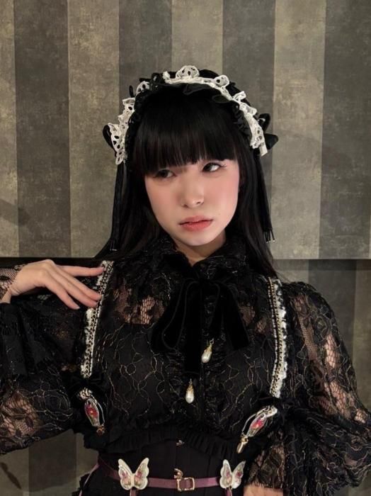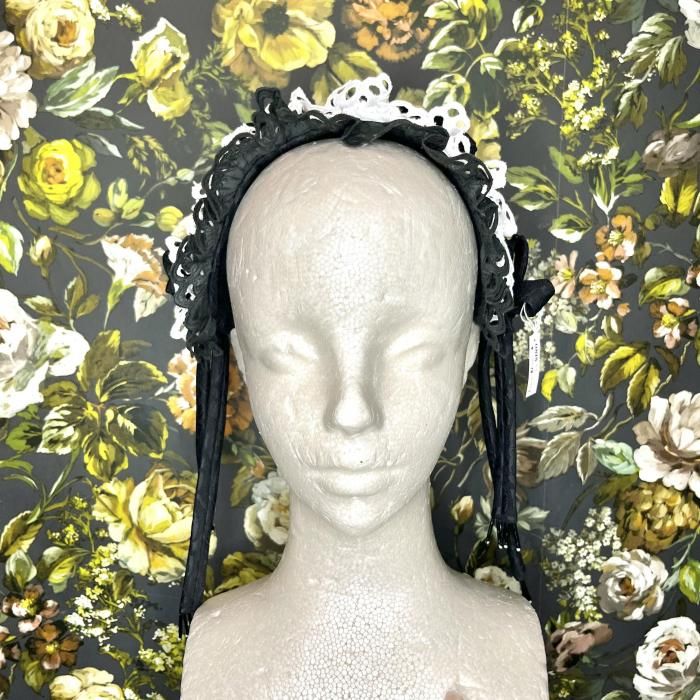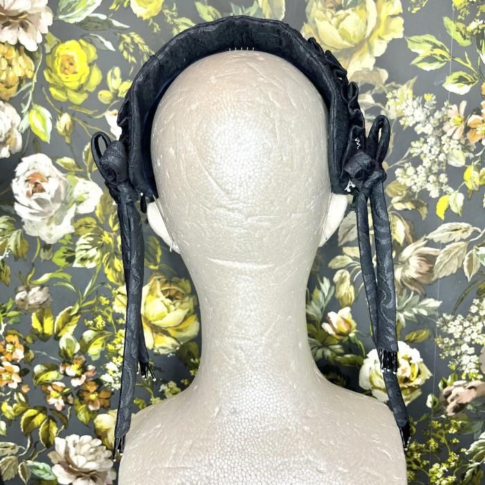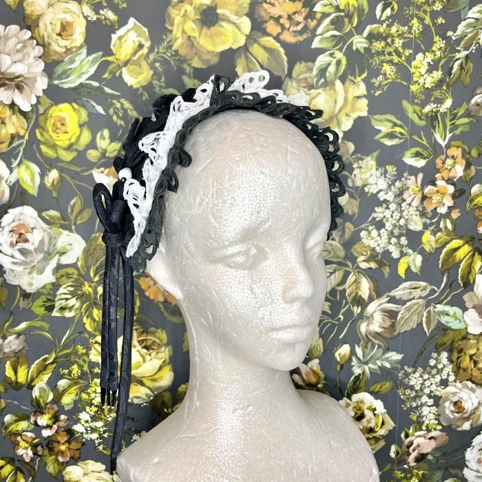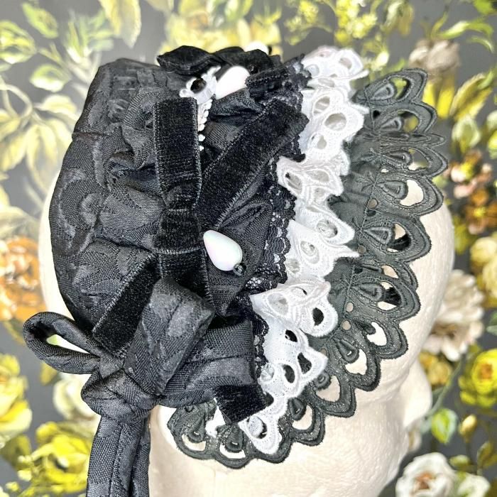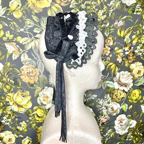 ◇ミニョネットボンネ(ブラック×ホワイト)◇ <ミニョネットのハーフボンネ> ミニョネット(お人形)がつけているような、 ジャガード生地で作られたカチューシャタイプのヘッドドレス。 サイドにはバイアスで作った共生地の結び紐が垂れ、 ヘッド部分にはリボンや飾りパーツが縫い付けてあり、細部まで可愛い作りになっております。 裏側の中心部分には小さなコームがついているので、こちらを中心に合わせて固定して頂くと 綺麗に着用出来ます。