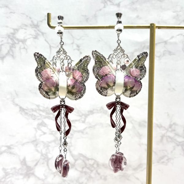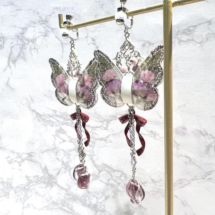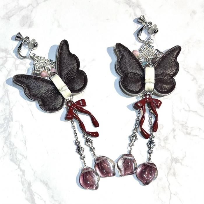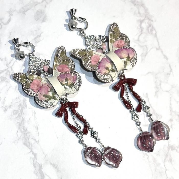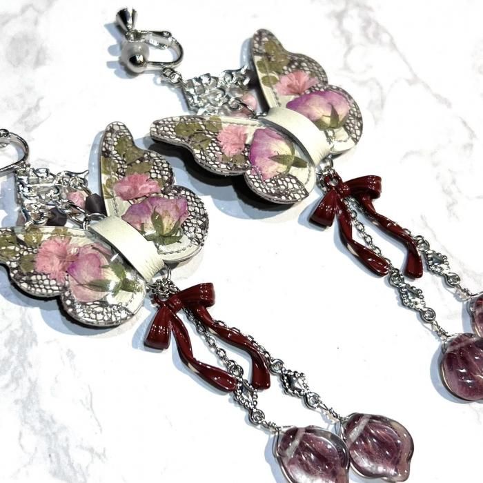 ◇いばら姫の花びらの耳飾り◇ テーマ「いばら姫」 ある王国に生まれた美しいおひめさま。 11人の魔女がそれをお祝いし、それぞれが徳や知恵、富などを授けましたが、 祝宴に招かれなかった13番目の魔女が仕返しに「15歳で死ぬ呪い」をかけて去っていきました。 そこでまだ魔法をかけていなかった12番目の魔女が「死ぬのではなく100年の眠りにつく魔法」にかえたのでした。 <いばら姫の花びらの耳飾り> 蝶々の形をした本革に押し花を閉じ込めた花蝶シリーズ。 いばら姫に因んでバラの花びらが揺れるデザインとなっております。 素材:クリアシート、本革、ガラスビーズ、合金パーツ ピアス/イヤリング金具:サージカルステンレス&ニッケルフリーメッキ